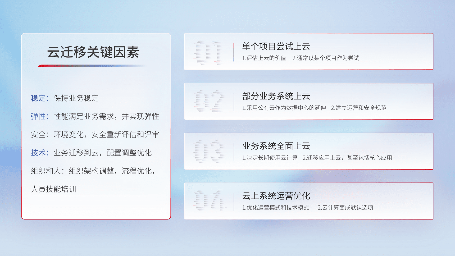 结合实际业务,,从规划设计、、、云平台选型、、、云原生改造、、、数据迁移、、、集成交付,,,迁移全过程为客户识别最佳上云路径,,,,做好风险识别管理,,,设计网络架构、、、身份权限、、、、安全审计合规、、、、操作审计、、、、日志审计、、、、监控告警策略、、、多站点容灾设计等,,,,对云上基础设施进行整体规划,,,,提升IT治理水平,,以满足弹性、、、高可用、、、、高性能的需求。。。
