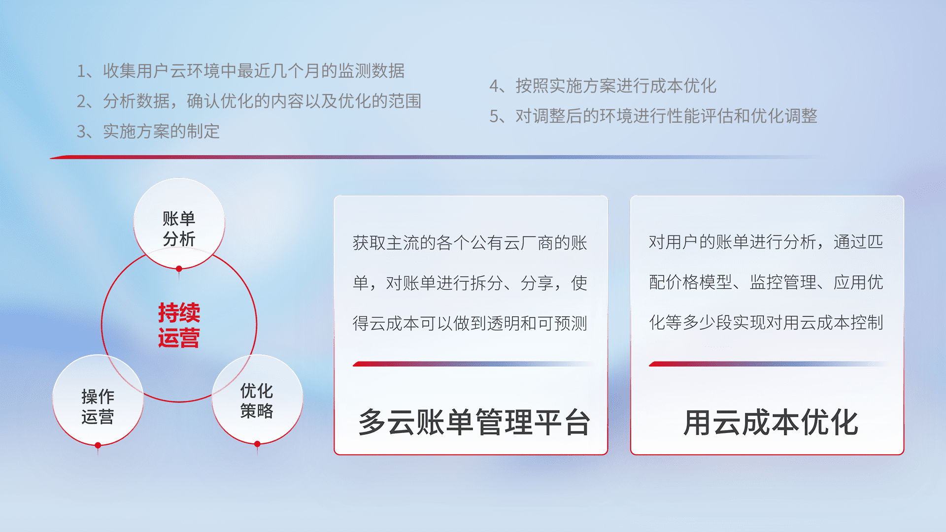 通过多云纳管,,,以统一的资源数据模型把客户的云资源进行抽象和封装,,,,进而实现对多云资源的统一操作,,,保障云资源管理的可靠性、、、稳定性与可用性。。。量身定制化运维内容,,,配置、、、开发运维、、、补丁管理、、、备份、、、、监控、、认证和访问管理、、审计和日常巡检等,,,,保障在用云过程中的可靠度,,,稳定度以及高可用率。。。
