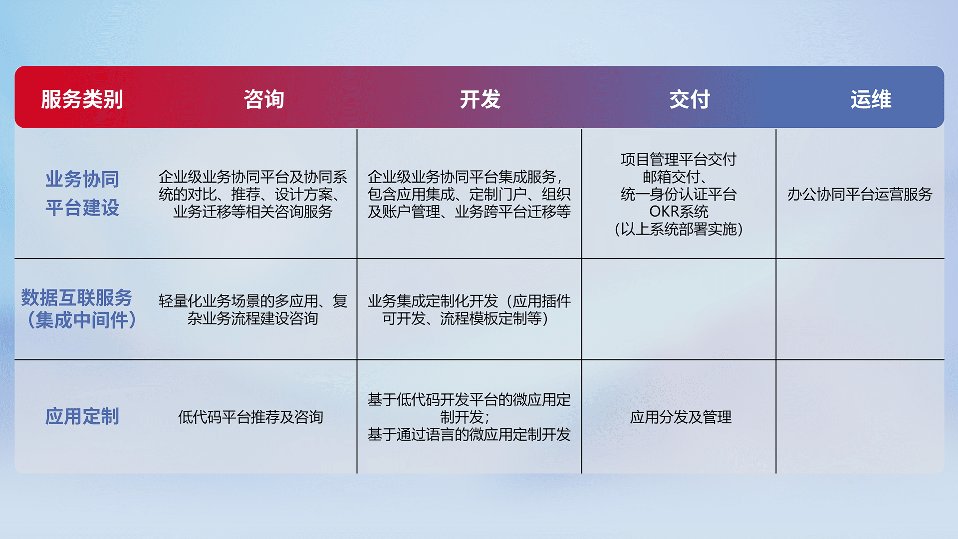 针对钉钉、、、企微、、IDaas等平台级产品提供产品的规划、、、方案、、交付、、、、定制化开发等服务,,实现如统一协同办公、、智能客户服务、、混合会议管理、、智能数据查询、、等业务场景,,,实现数字化转型。。
